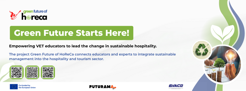 Tekst prezentuje również projekt „Green Future of HoReCa”, realizowany przez EVACO (Polska) i FUTURAMA 4P (Macedonia) w ramach programu Erasmus+, którego celem jest rozwój kompetencji nauczycieli i trenerów zawodowych w zakresie zrównoważonego rozwoju i ESG w branży HoReCa. Artykuł zawiera także mapę drogową działań ESG do 2030 roku oraz zapowiedź materiałów edukacyjnych i narzędzi, które pomogą firmom wprowadzać zielone praktyki.